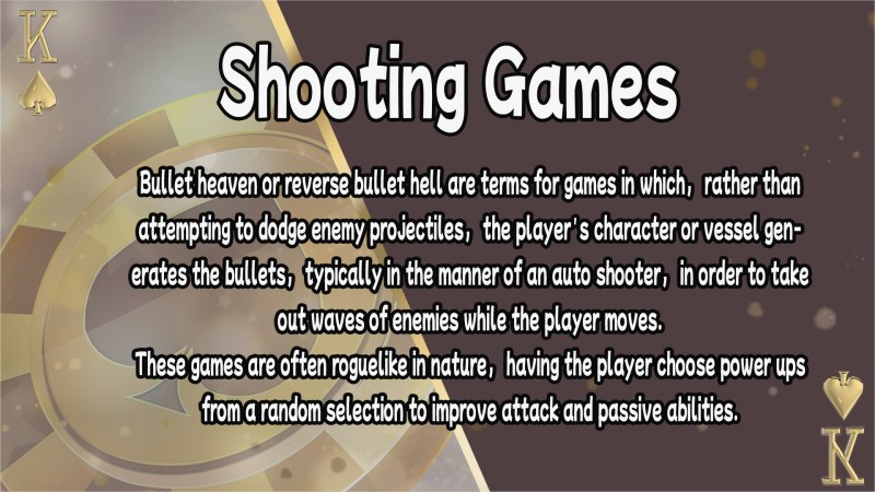 Bullet heaven or reverse bullet hell are terms for games in which, rather than attempting to dodge enemy projectiles, the player’s character or vessel generates the bullets, typically in the manner of an auto shooter, in order to take out waves of enemies while the player moves. These games are often roguelike in nature, having the player choose power ups from a random selection to improve attack and passive abilities. Such games became popular with the release of Vampire Survivors in 2022, and include games like Brotato, 20 Minutes Till Dawn, and HoloCure – Save the Fans!.(引文)